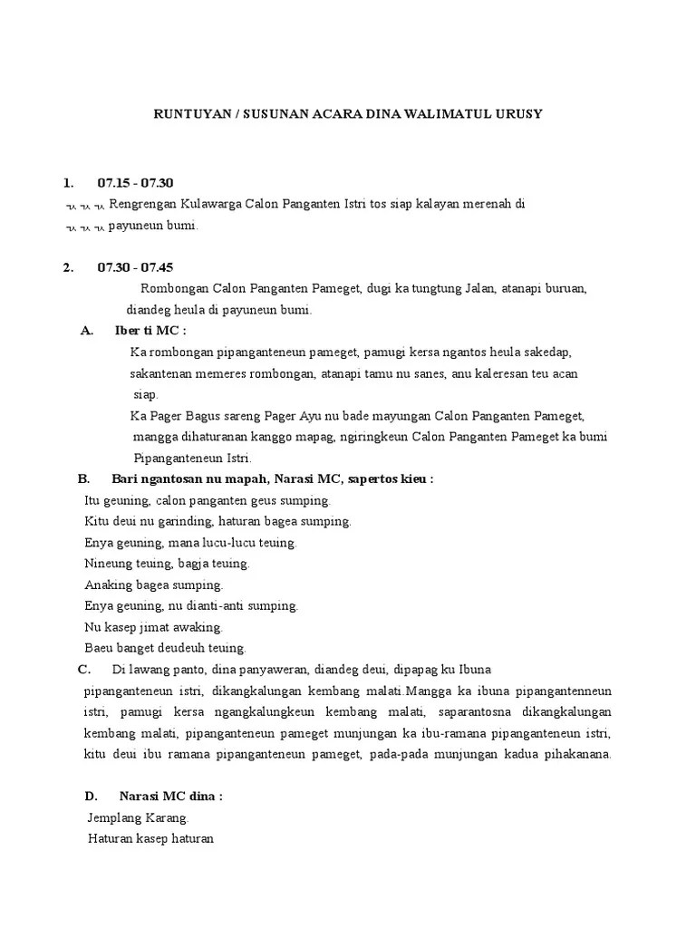 Contoh teks mc bahasa sunda tentang pernikahan. Contoh teks panata acara dalam bahasa sunda. Doc contoh teks mc wisuda unisma 2016 putri saniatul. teks mc pernikahan teks mc pernikahan home skenario dan naskah mc acara pernikahan kelas xii iis 1.docx … Bismillah, aku persembahkan lagi lagi spesial buat kamu yang mau nyoba ngemsi nikahan bahasa sunda atau barangkali dapet job mc nikah bahasa sunda nama :
