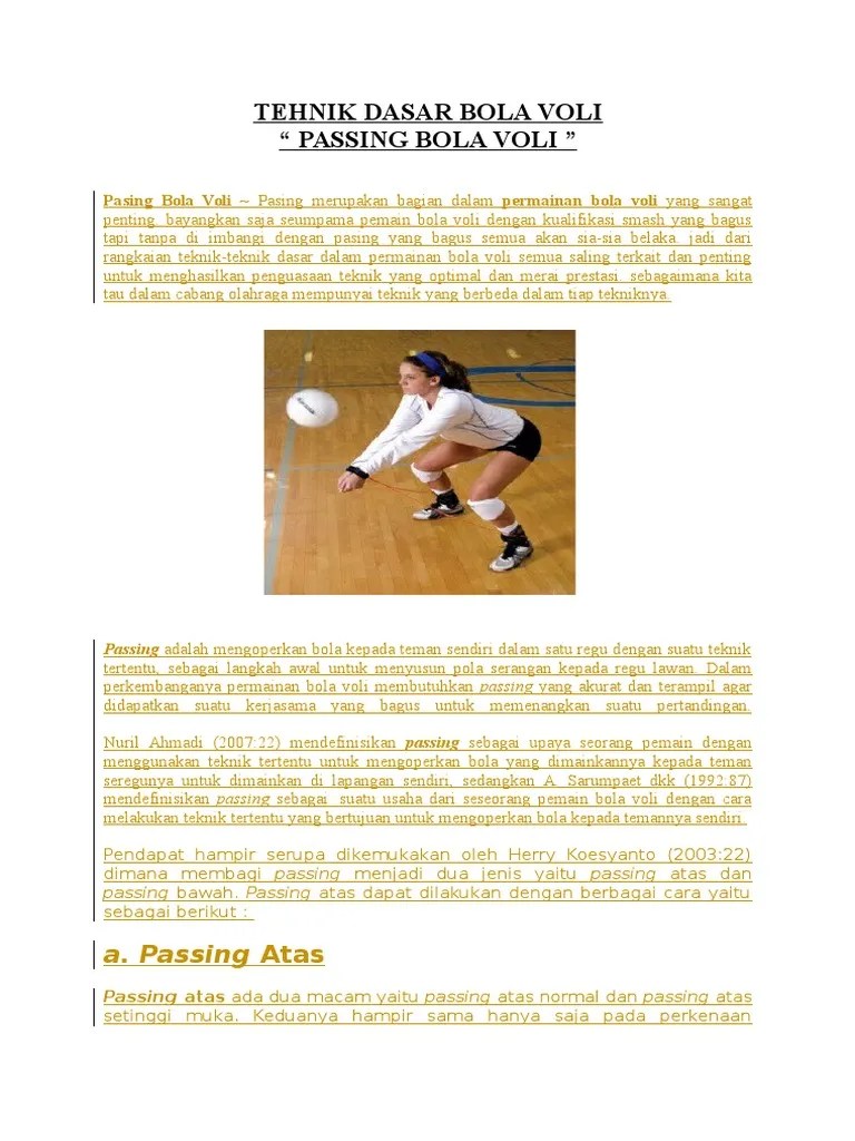 Teknik dasar passing bawah dan atas bolavoli . Dalam permainan bola voli ini, selain memperoleh . Pertama, pegang bola dengan kedua tangan setinggi dada. Smash atau spike adalah teknik dasar permainan bola voli yang dilakukan dengan memukul bola menggunakan kekuatan penuh sambil melompat, kemudian . Jelaskan prosedur atau cara melakukan passing bawah dalam permainan bola voli;